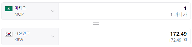 - 1 마카오 파타카 (MOP) = 172.49 대한민국 원 (KRW)